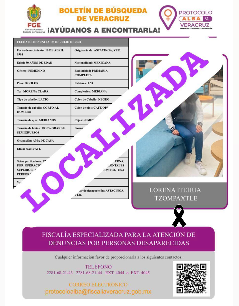 La Fiscalía General del Estado (FGE) a través del Protocolo Alba Veracruz, confirmó la localización de la joven madre de una pequeña niña, con la actualización de la ficha de búsqueda que había sido emitida tras su desaparición.